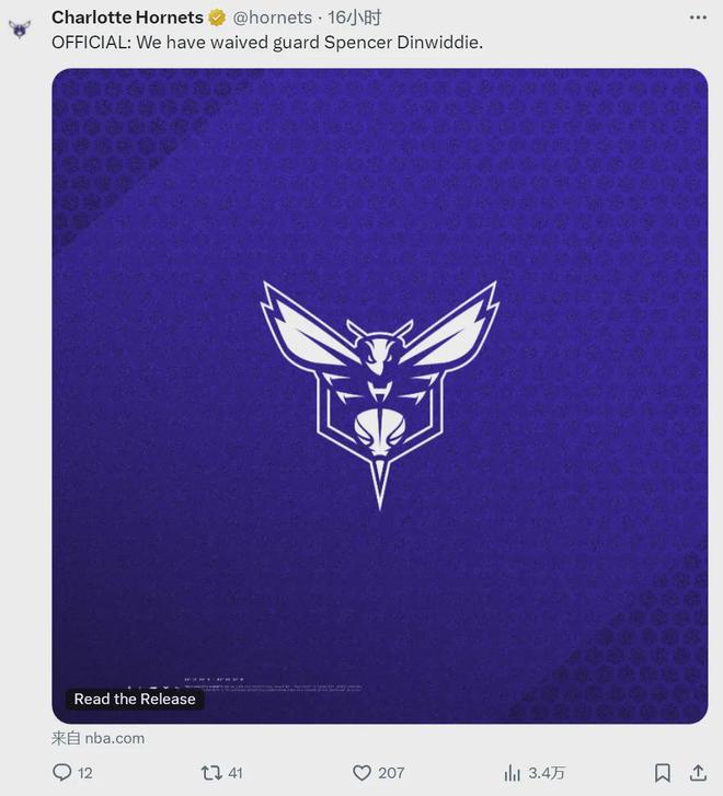 北京时间10月18日,黄蜂官方宣布:正式裁掉斯宾塞-丁威迪。今年夏天,丁威迪一年底薪加盟黄蜂。目前黄蜂有16份正式合同,必须在常规赛开始前裁掉一人,丁威迪成了牺牲品。连黄蜂这种垫底球队都不要他,丁威迪很难找到下家了。