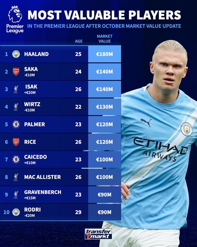 目前福登最新身价8000万欧元,罗德里最新身价9000万欧元,曼城队内目前仅剩哈兰德一位亿元先生,这位挪威前锋以1.8亿欧元领跑英超身价榜单。