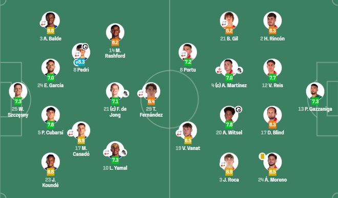 应当说,巴塞罗那在本场比赛进入状态还是比较早的,开赛第12分钟,他们就完成了首开记录的破门。这是一次非常标准的巴萨式进球配合,亚马尔在右路拿球之后、吸引到了对方多名防守人的跟随,之后他非常巧妙地给到了佩德里。