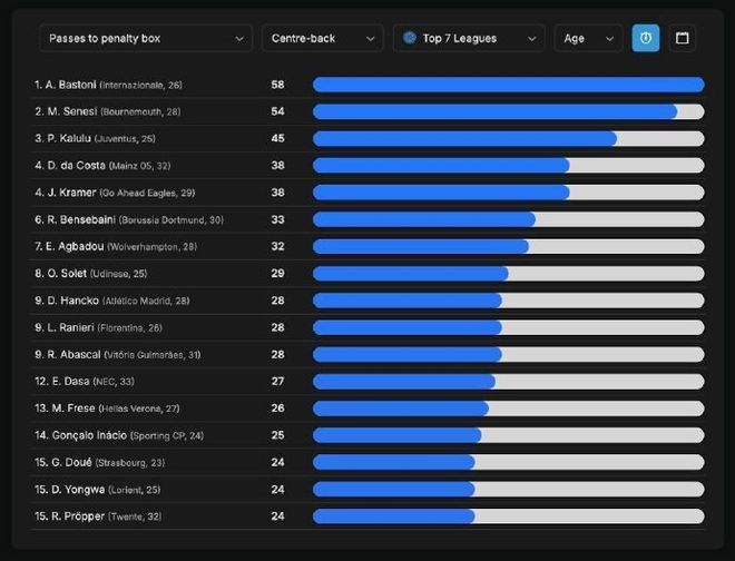 根据意甲数据显示,巴斯托尼本赛季已经63次将球传入进攻三区,这一数据在联赛中排名第6,前五位都是像莫德里奇这样的中前场球员。更令人惊讶的是,他16次将球传入禁区,排在意甲第4位。在欧冠赛场上,巴斯托尼的这一特质更加明显。他的五个欧冠助攻分别是在对阵门兴、巴萨、比尔森胜利、本菲卡和布拉格的比赛中完成的,每一个都价值连城